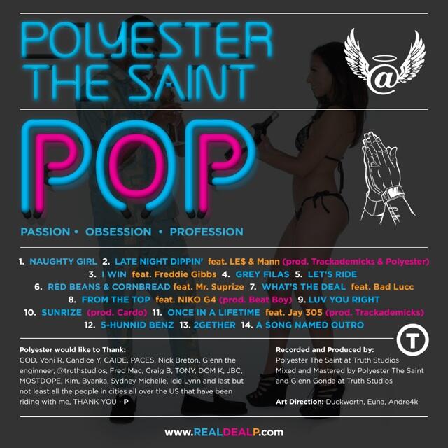Original west coast rap is almost obsolete at this point in time. Producer and bonifide rapper Polyester The Saint is here to save the day. Producer by day rapper by night, Polyester does it all out of his homebase at Truth Studios in LA. His resume includes production for Dom Kennedy, Casey Veggies and many more upcoming artists. Today Polyester aka Real Deal P released his forthcoming album POP for free on Soundcloud and purchase on iTunes. His two previous mixtapes are known for their spot on westcoast production as well as the overall feel of California summer music. POP includes features from OPM (Other Peoples Money) teammates Jay 305 and Niko G4. Besides HellaGood beats from Polyester himself, a few other next to blow producers contribute their originality to the project, like Trackademics, Beat Boy and Taylor Gang affiliate Cardo. POP sounds just like the title, bright, colorful, and envigorating. Stream below or Click Here to buy on iTunes.